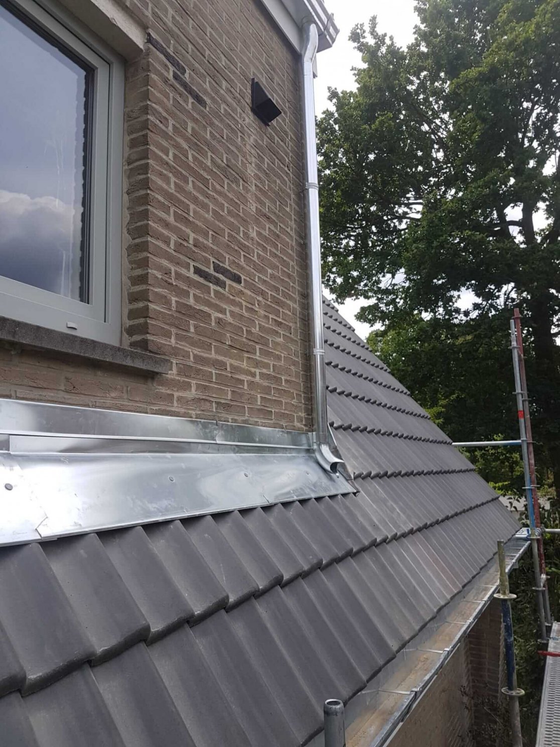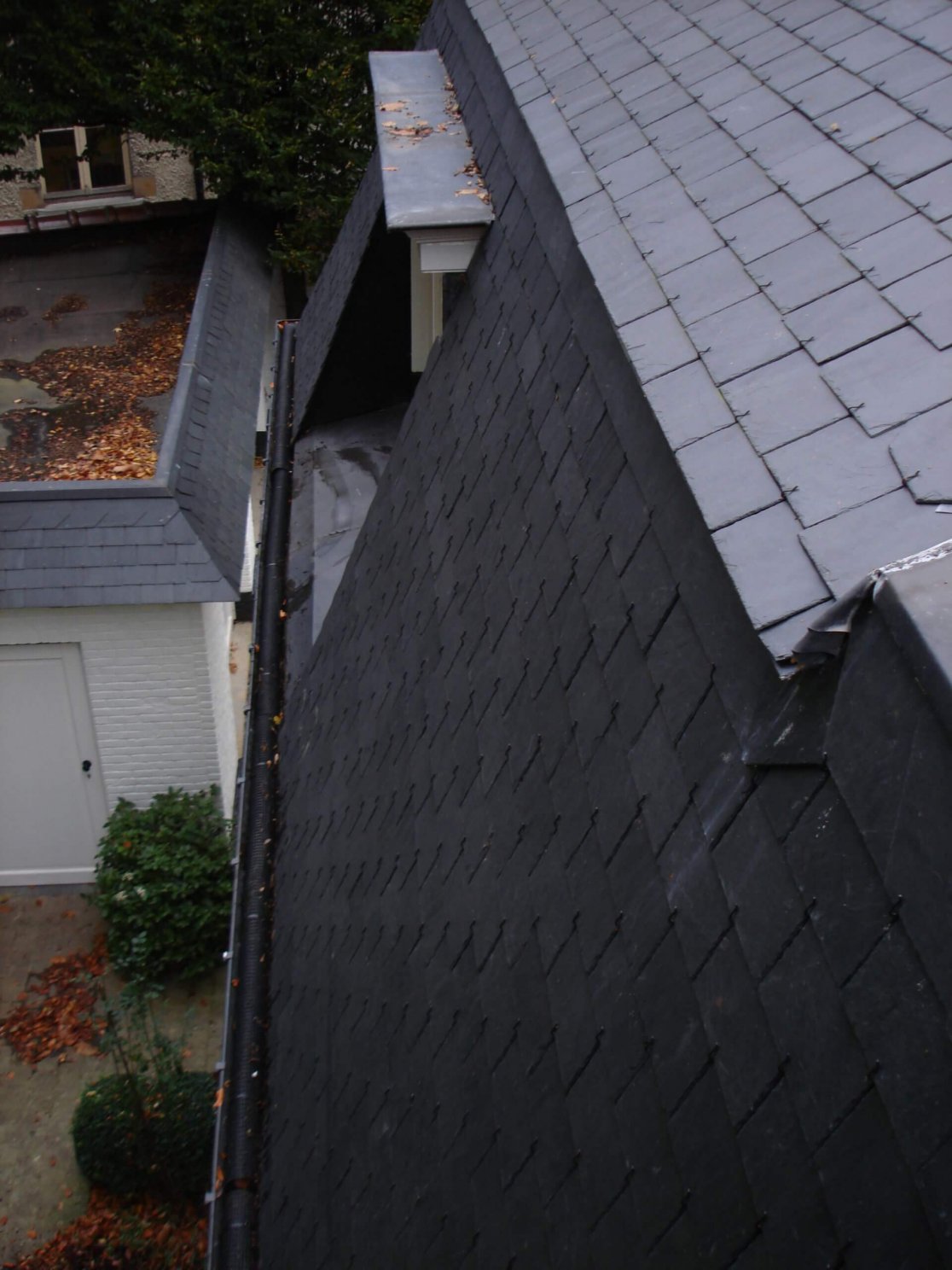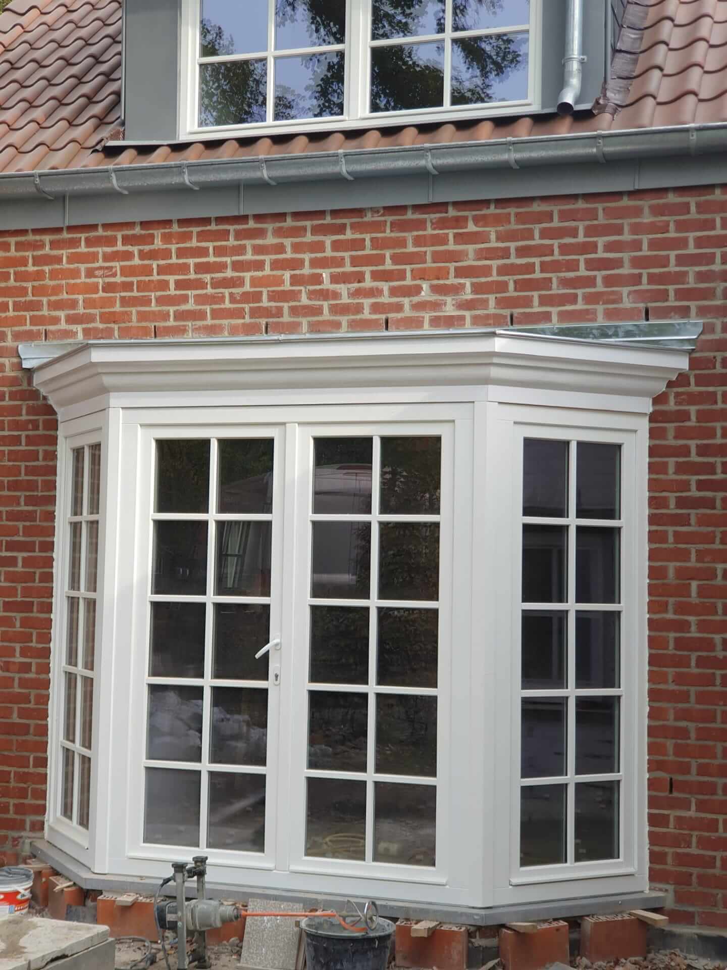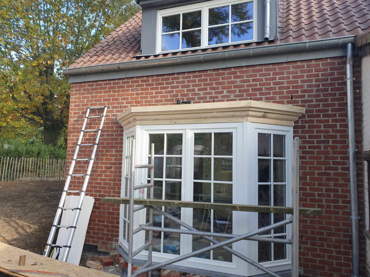 Charpente, couverture en tuiles en terre cuite, rives en ardoises naturelles, lucarne en zinc et bow-window en zinc